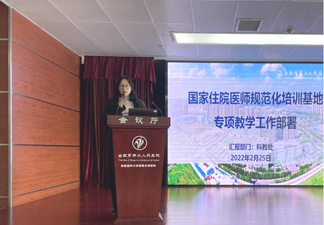 科教处罗玉婷老师首先对医院2021年国家住培结业考核通过率、年度业务水平成绩、年度考核结果进行通报,并带领参会人员学习了最新版《国家住院医师规范化培训结业临床实践能力考核标准方案》。 科教处教学办公室杨续兵主任就《关于修订合肥市二院国家住院医师规范化培训期间待遇问题若干规定的通知》和《关于组织开展 2022 年安徽省住院医师规范化培训结业考核工作的通知》文件作了详细解析。